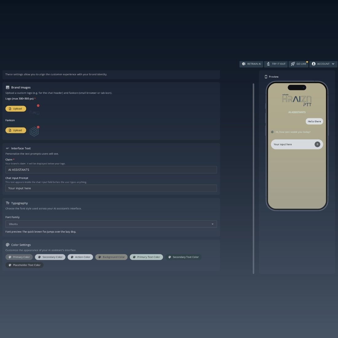 You can adjust the branding, text, and tone of your customer-facing interface. You can also upload documents and information specific to your company – and HRAIZN PTT will use that to generate smarter answers. And you can impact the behaviour of HRAIZN PTT for certain use-cases via our Custom Instructions feature.