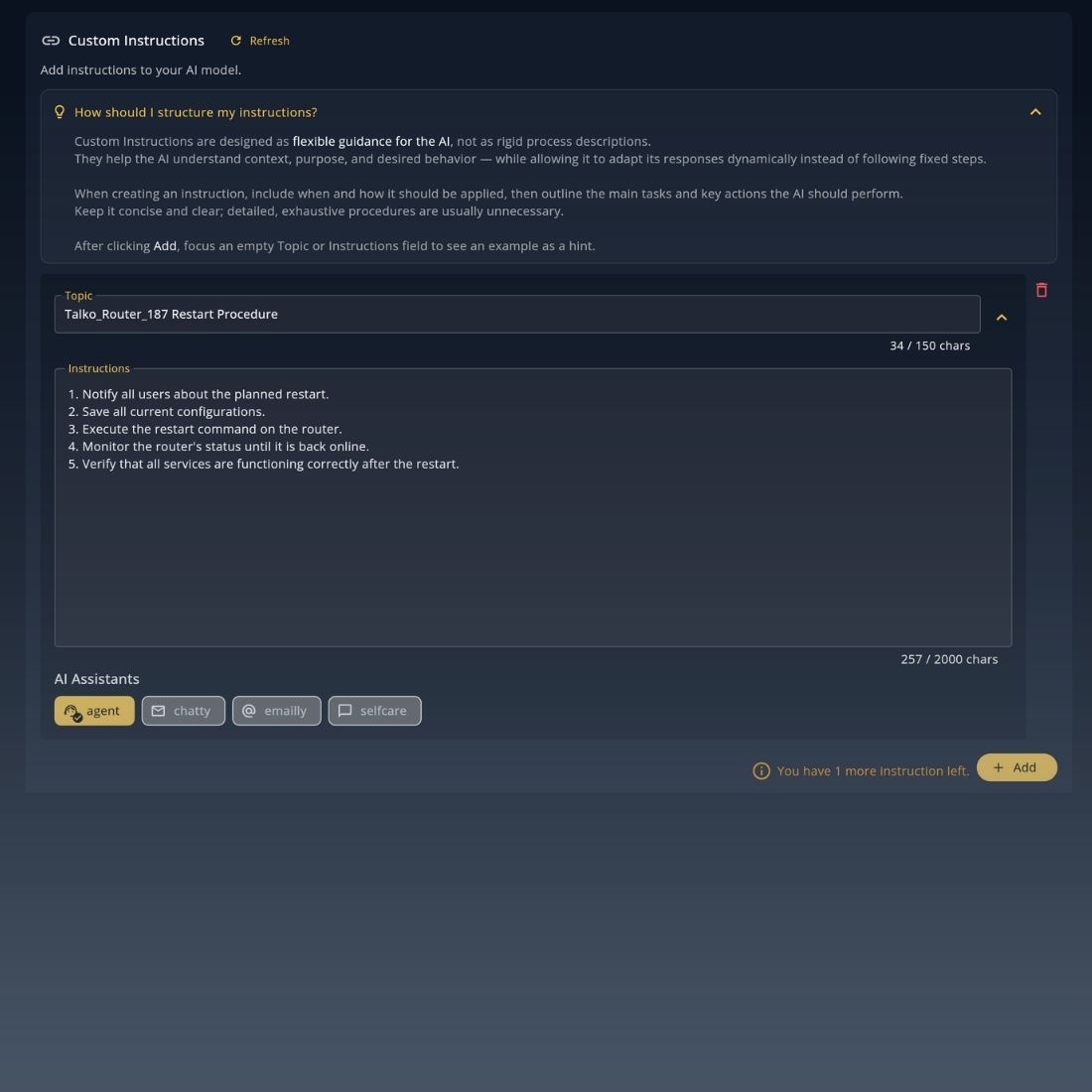 This provides an added layer of control and reliability for sensitive or specialized scenarios, without limiting flexibility. Each assistant can follow its own set of instructions, making it easier to support diverse requirements across teams, customers, and channels.