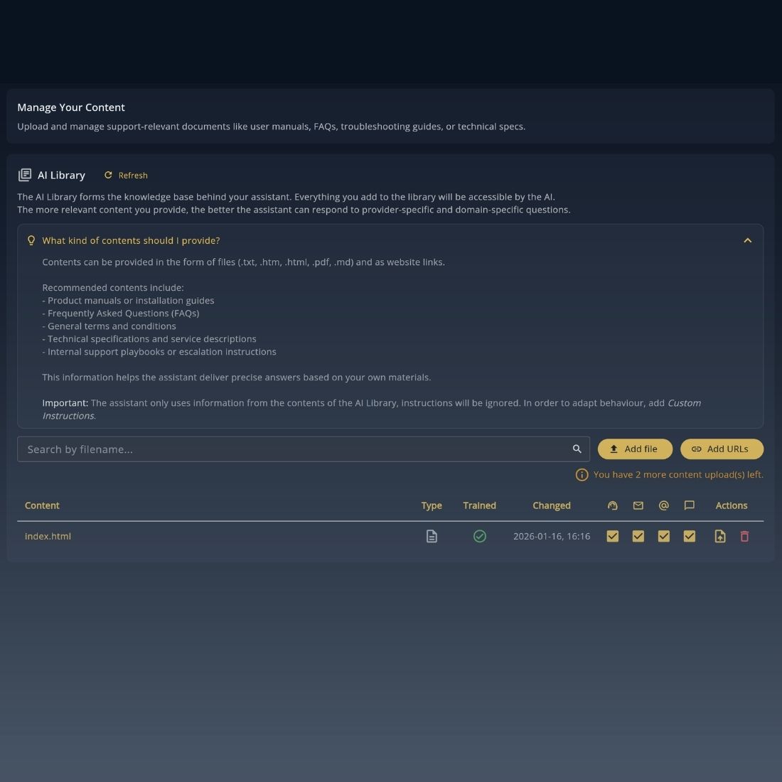Yes, you can upload FAQs, manuals, and other relevant documents to enhance your assistant’s knowledge. However: You are responsible for the content’s accuracy and legality. Make sure to make the Assistant private if you upload sensitive information.