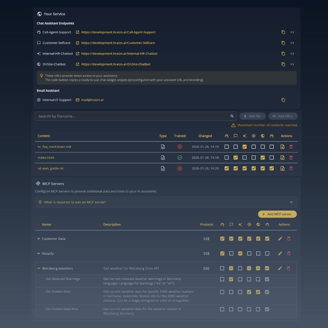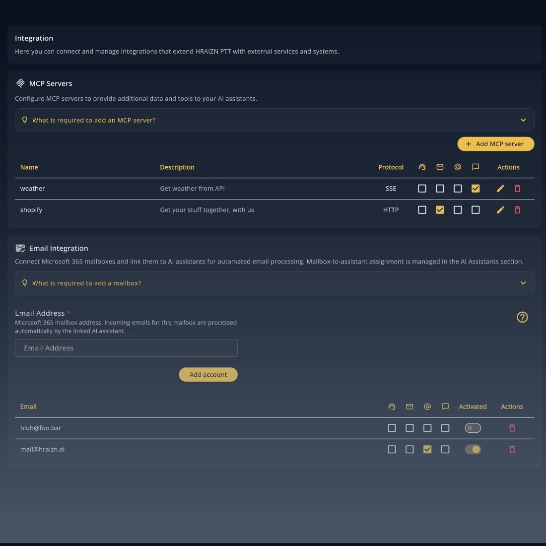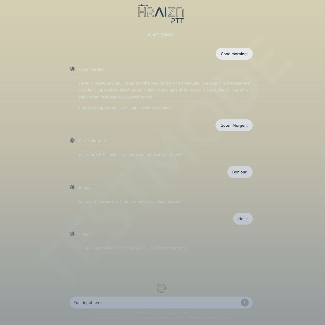 By using the Model Context Protocol, HRAIZN PTT integrates cleanly with existing tools without hard-wiring logic into the assistant itself. This keeps interactions flexible, controlled, and ready to evolve as systems and use cases change.